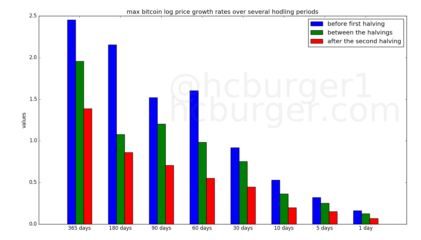 The maximum growth rate over several hodling periods systematically declines over the three bitcoin halving periods: