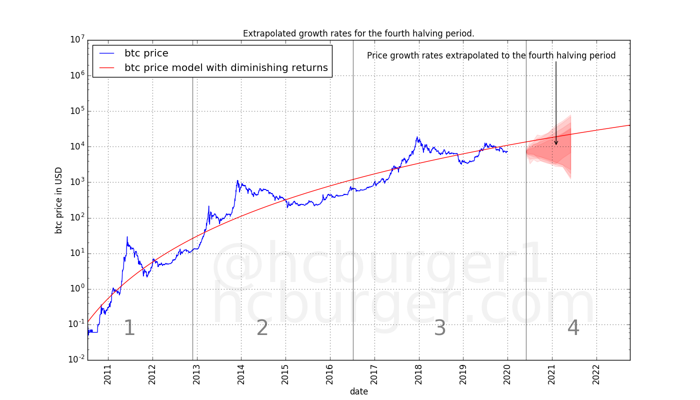 Also, it is not quite correct to say that the S2F model has non-diminishing returns: In the early history, returns as modeled by the S2F model are indeed diminishing. The returns only diminish up to a certain point, though (approximately a 10x return every 4 years).