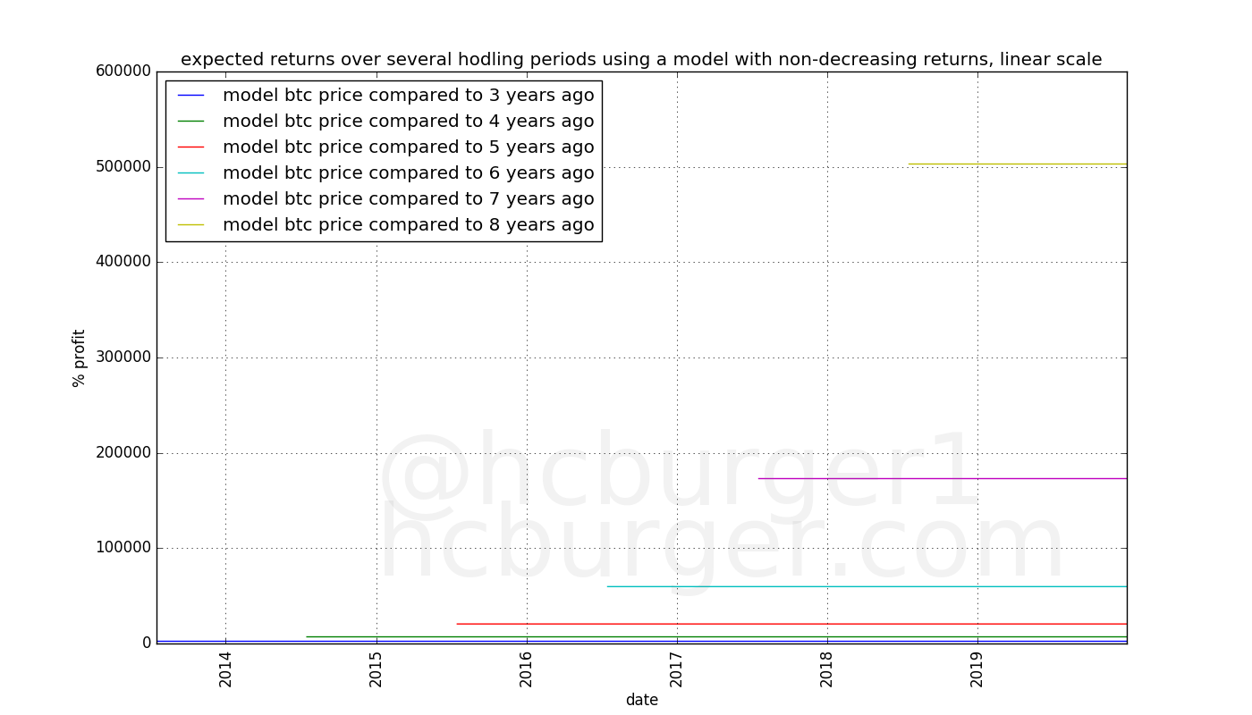 Let’s assume that bitcoin’s price follows a non-diminishing model. How much money can an investor expect to make? The answer depends on the amount of time the investor held his bitcoin before selling them (the “hodling period”). The longer the hodling period, the higher the expected return. What is interesting is that for the model with non-diminishing returns, the profit the investor can expect to make does not depend on when he invested.