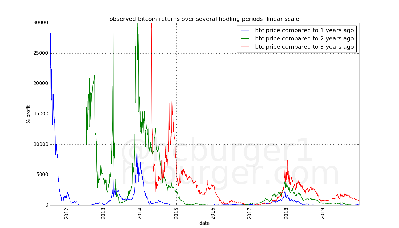 We see that according to this model, an investor who bought bitcoin and sold them 3 years later would have made a profit of approximately 2500% no matter when this investor bought his bitcoin. The same holds true for any other hodling period, but the returns are higher for longer hodling periods.