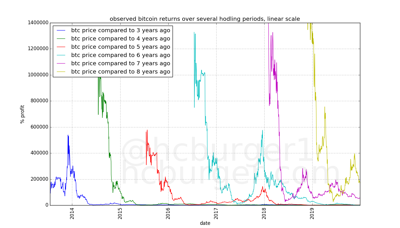 In the semi-log chart, we notice very low returns for the 3-year hodlers around the 2017 mark. This is because the price around 2017 was about $1000, approximately the same as during the previous all-time-high, around 2014. Someone who bought at that all-time-high and sold three years later could have made a small loss.