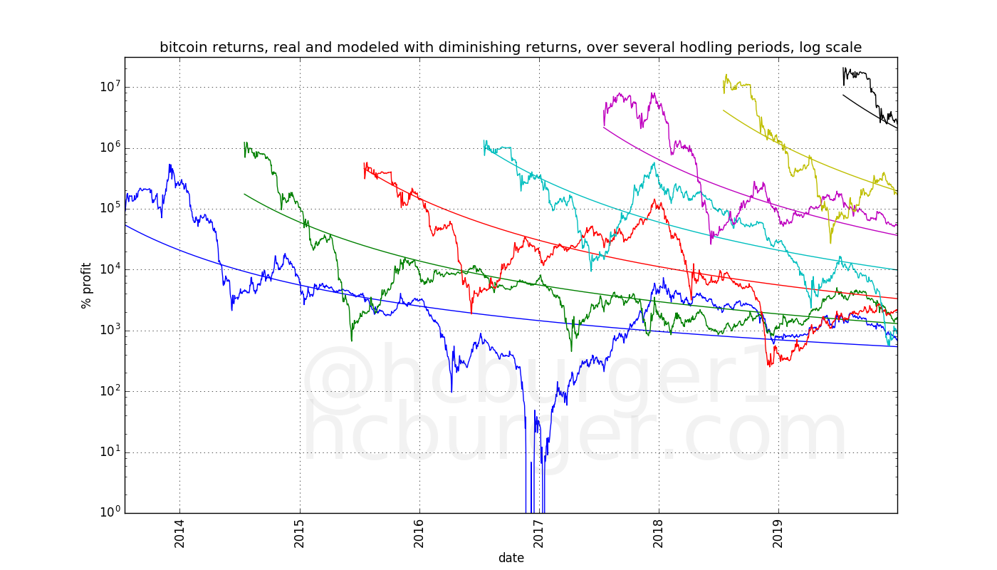 Let us now compare the real return curves to those based on model data using a model with diminishing returns. The same color-code is used for the length of the hodling periods: