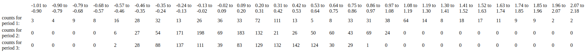 The histogram of the 180 day growth rates for the three halving periods can be displayed in a table: