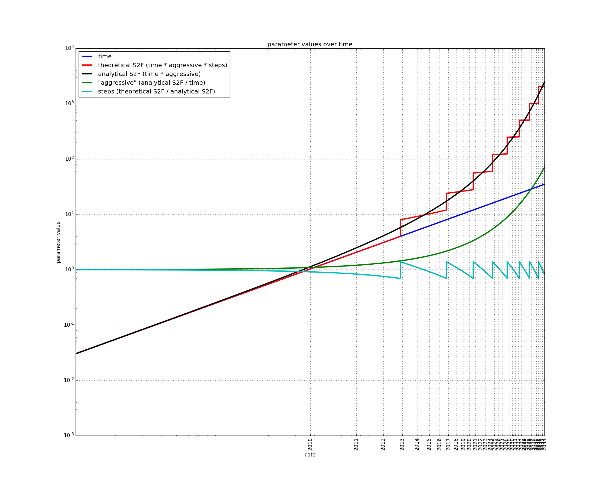 At first, the analytical S2F is adequately approximated by the time variable, but the two variables diverge later on. This is expected since time is the first component of the Taylor series expansion of the analytical S2F. The divergence between time and the analytical S2F is due to the “aggressive” variable.