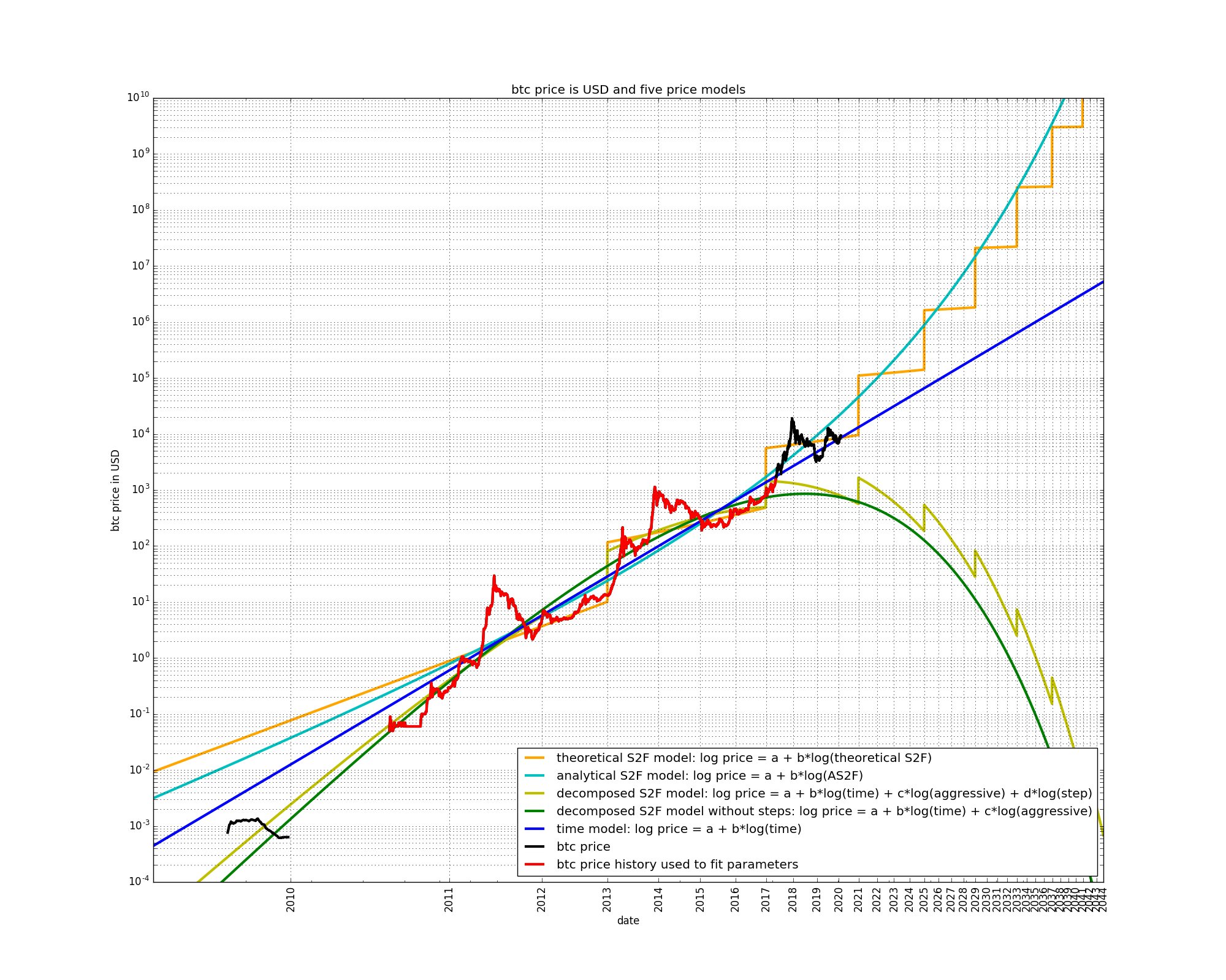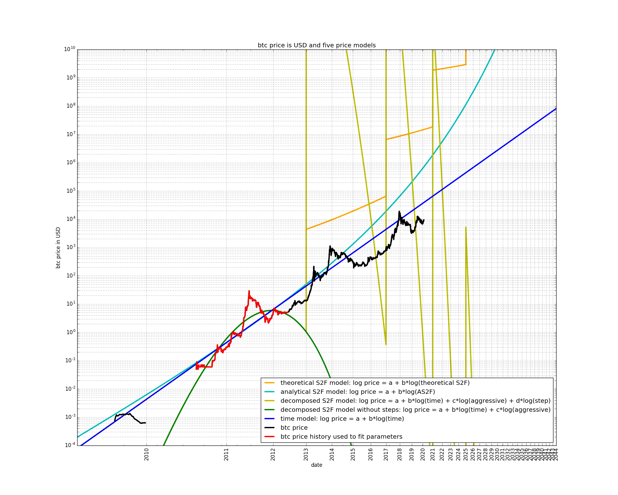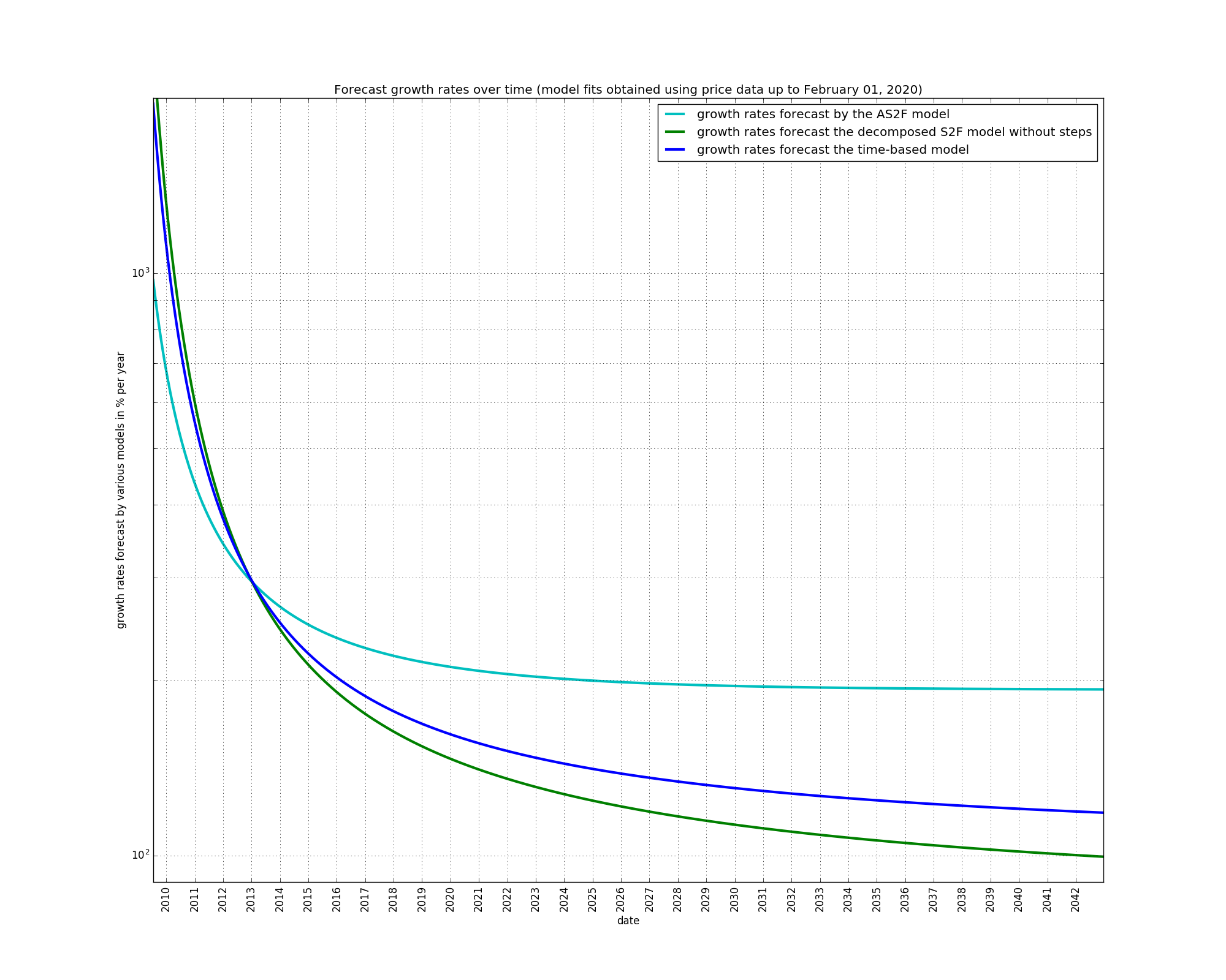 A final observation is that the early price data of 2009 is better fit by the models which have the growth which is the most diminishing, i.e. the decomposed S2F models better fit the early price data than the S2F and AS2F models.